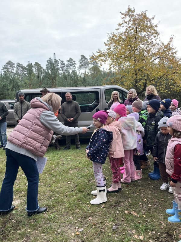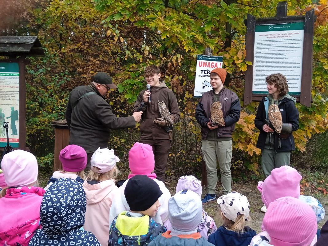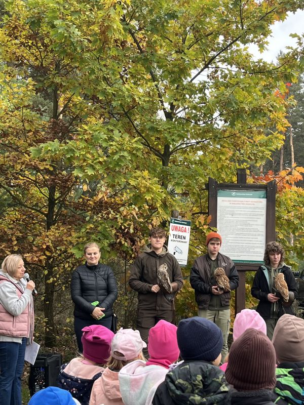 Nasi uczniowie w składzie – Urszula Turalska, Antonina Witczyk, Piotr Bała oraz Wiktor Dziewięcki - zostali bardzo ciepło przyjęci przez wszystkich uczestników. Na powitanie gości dzieci zaśpiewały okolicznościową piosenkę, dodając układ taneczny. Wiktor Dziewięcki, jako przedstawiciel Sokolników i Ośrodka Rehabilitacji Ptaków Drapieżnych przy Zespole Szkół Leśnych w Zagnańsku, opowiedział o działaniach prowadzonych w Ośrodku przez uczniów oraz o poszczególnych gatunkach ptaków będących pod ich opieką. Potem były pytania od najmłodszych, na które opiekunowie ptaków cierpliwie odpowiadali. Organizatorzy Dnia Drzewa przygotowali poczęstunek w formie grilla z pieczoną kiełbaską, owoców, ciepłej herbaty oraz pysznej drożdżówki. Na zakończenie wykonane zostały pamiątkowe zdjęcia, a Sokolnicy otrzymali dyplom „Przyjaciela Przedszkola”.