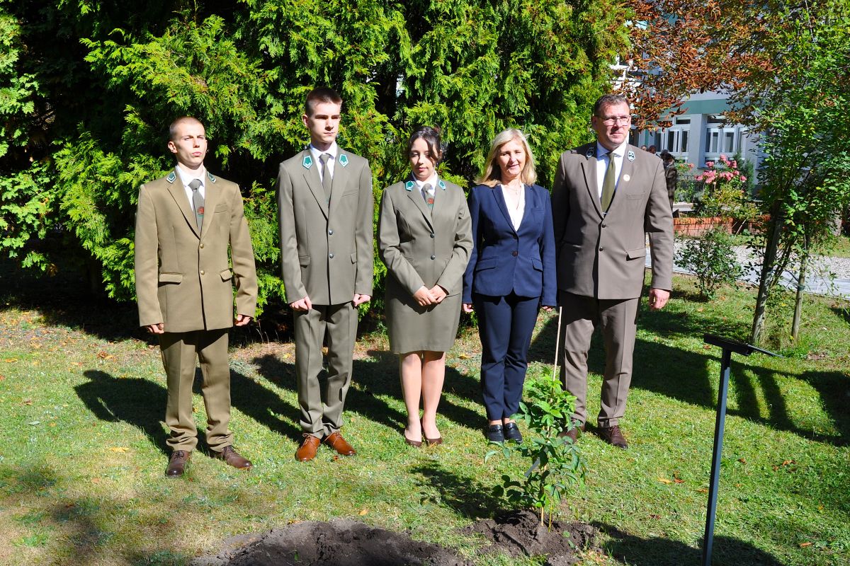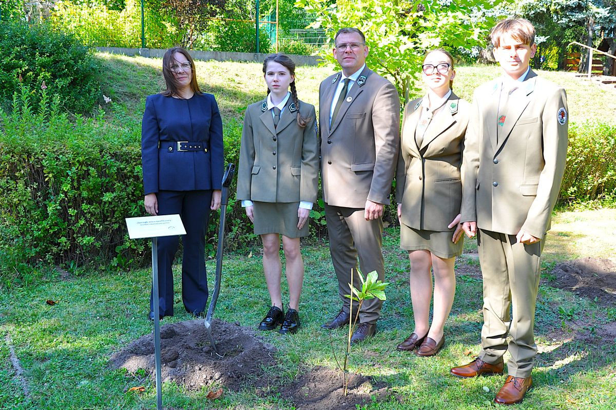 Następnie, zgodnie z tradycją, przedstawiciele klasy I a wraz z wychowawczynią – panią Jolantą Grudniewską oraz klasy I b z wychowawczynią – panią Agnieszką Chonzatko zasadzili pamiątkowe klasowe drzewa, którymi będą się opiekować w czasie nauki w Technikum Leśnym. Po zasadzeniu drzew wszyscy uczniowie klas I otrzymali koszulki z logo naszej szkoły ufundowane przez Stowarzyszenie „Knieja”, a także sadzonki drzewek ufundowane przez Nadleśnictwo Daleszyce. Wręczenia dokonał pan Michał Buczyński – wiceprezes Stowarzyszenia „Knieja” wraz z dyrekcją szkoły oraz wychowawczyniami.
