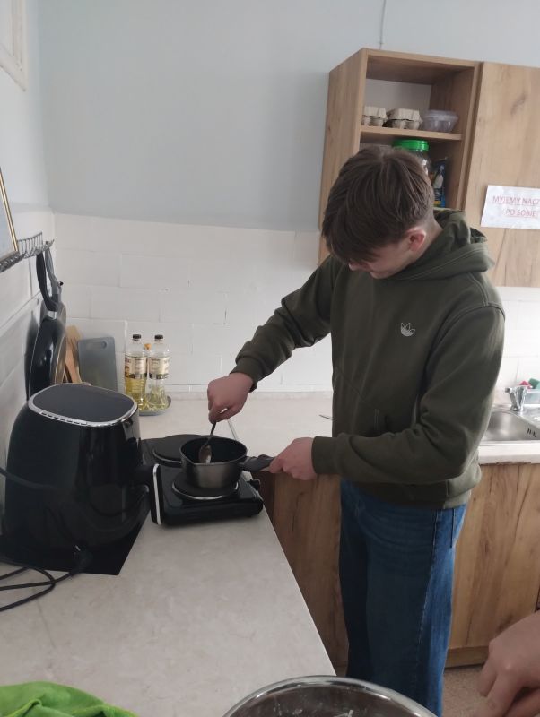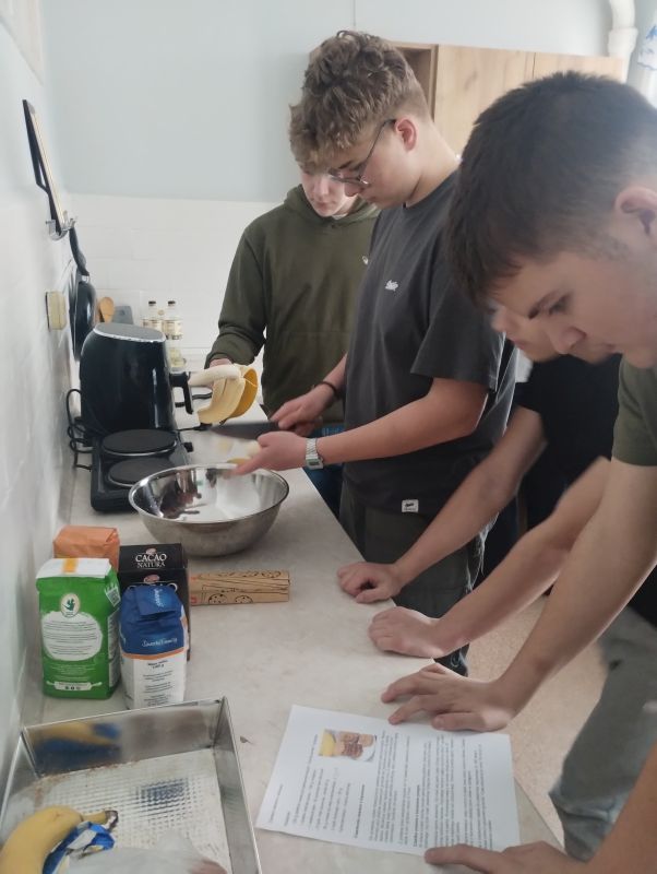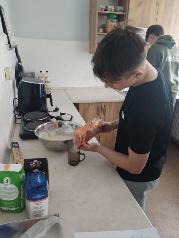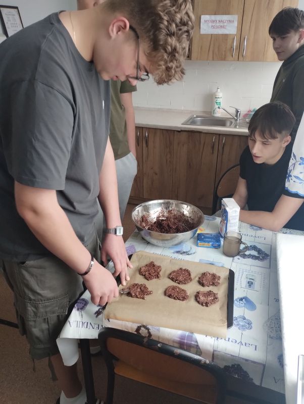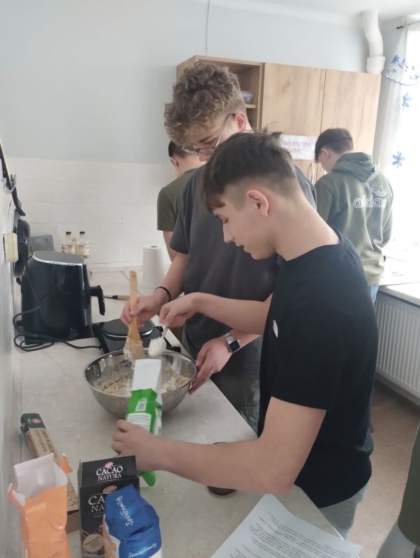 Podczas zajęć uczniowie wykazali się kreatywnością oraz zaangażowaniem. Wspólnie przygotowali pyszny sernik piankowy, który zachwycił swoją lekkością i delikatnym smakiem. Powstały też kruche ciasteczka w czekoladowej polewie oraz zdrowe i pożywne słodkości - ciasteczka owsiane w dwóch odsłonach – tradycyjnie pieczone oraz w wersji bez pieczenia, co było ciekawym doświadczeniem i inspiracją do eksperymentowania w kuchni.
