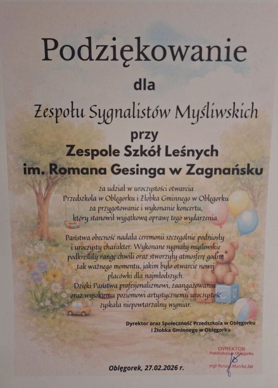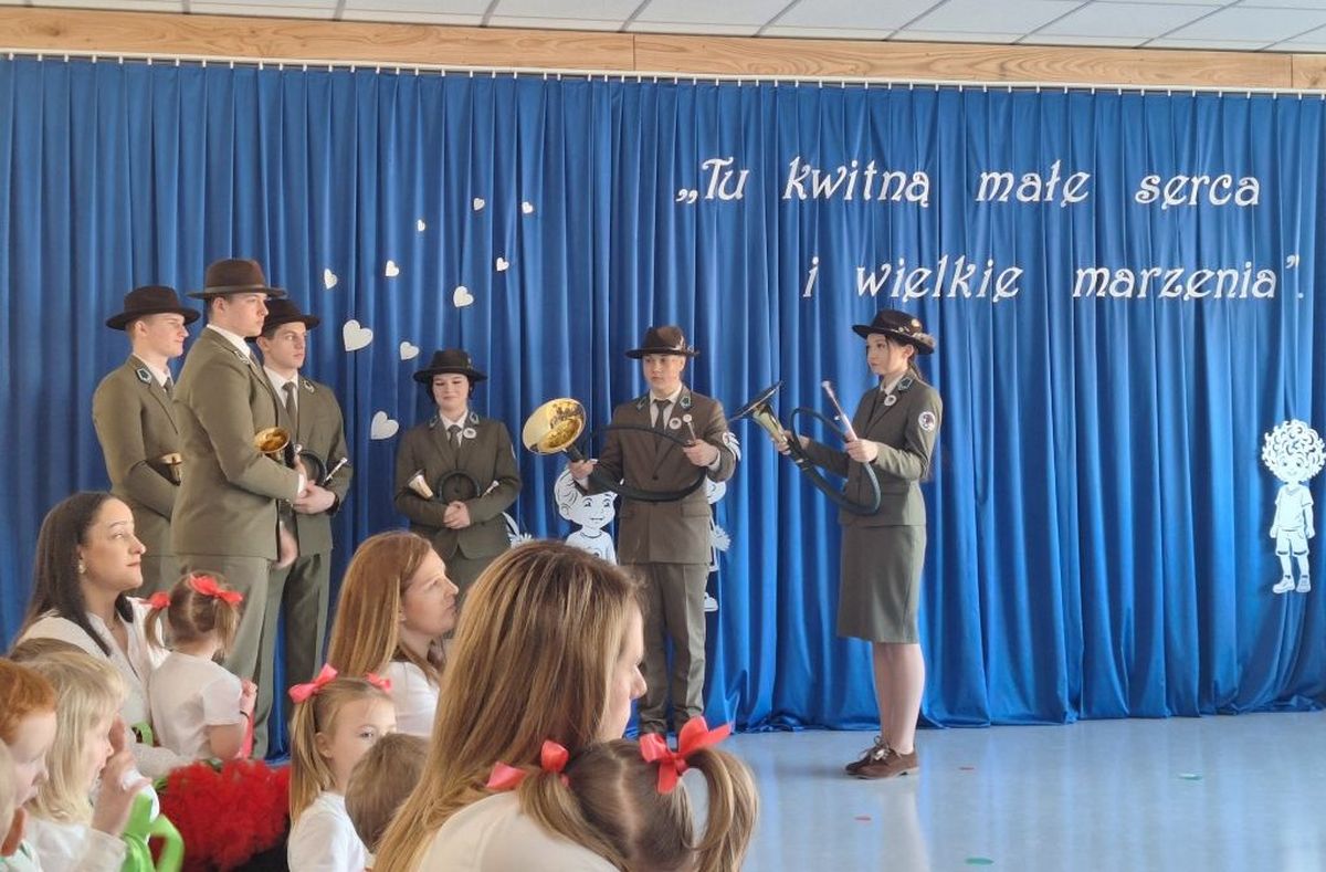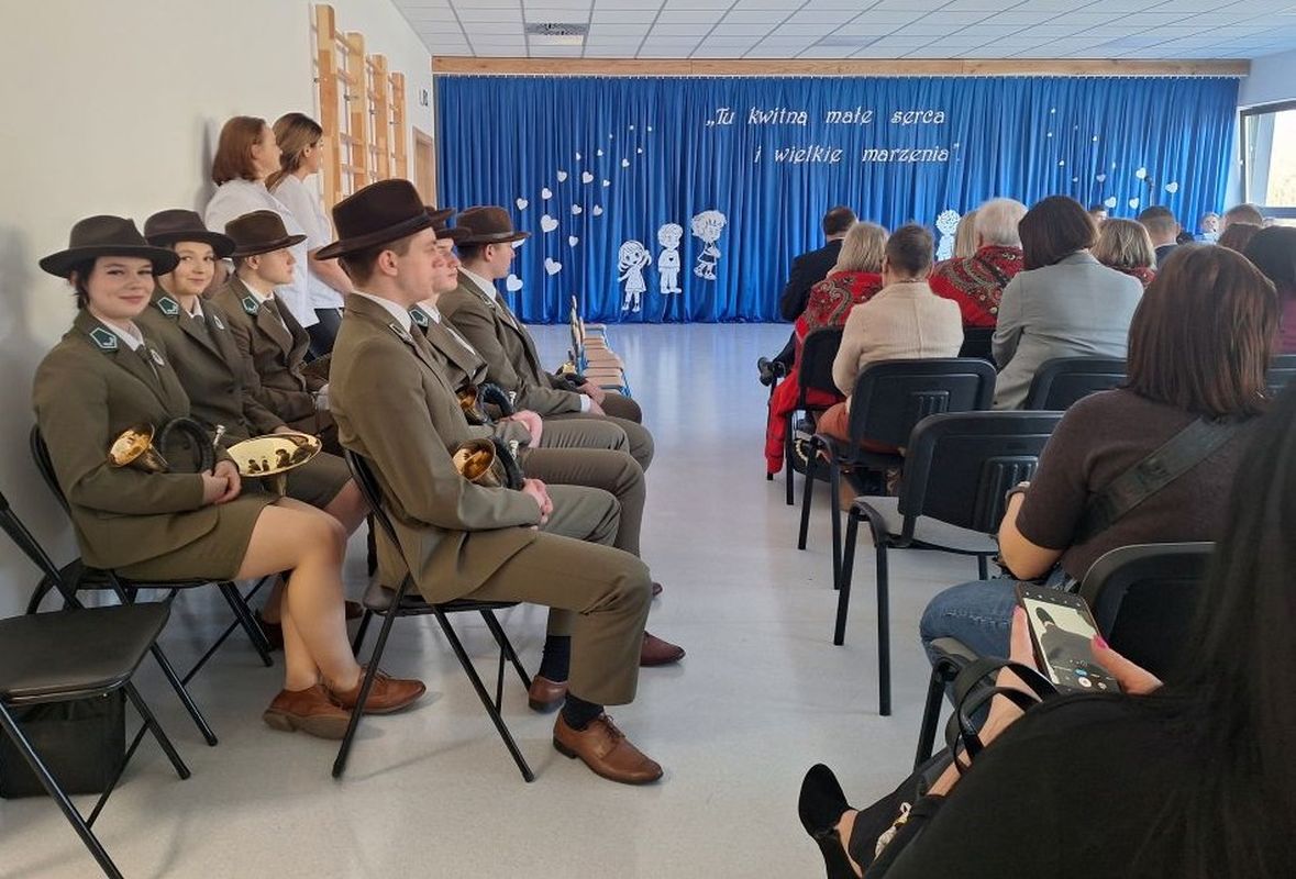 27 lutego 2026 roku sygnaliści myśliwscy z Technikum Leśnego w Zagnańsku wzięli udział w uroczystym otwarciu Przedszkola i Żłobka Gminnego w Oblęgorku.