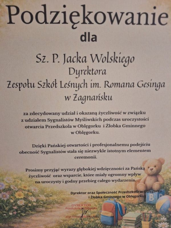 Podczas uroczystości pani Renata Monika Jas – dyrektor nowo otwartej placówki wręczyła dyplomy z podziękowaniami — dla Zespołu Sygnalistów Myśliwskich oraz pana dyrektora Jacka Wolskiego.